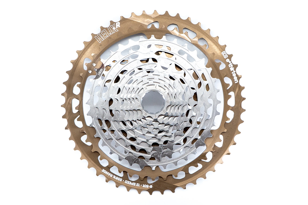 There’s something satisfying about e*thirteen’s new Helix, aside from the fact it can deliver the biggest gear range of any drivetrain out there and boasts 12 sprockets from 9-50t. It’s the sheer brazen nerve of e*thirteen that we find so gratifying, tweaking the noses of the drivetrain greats – SRAM and Shimano – and producing a cassette that purportedly works in conjunction with both and bests them at their own game.