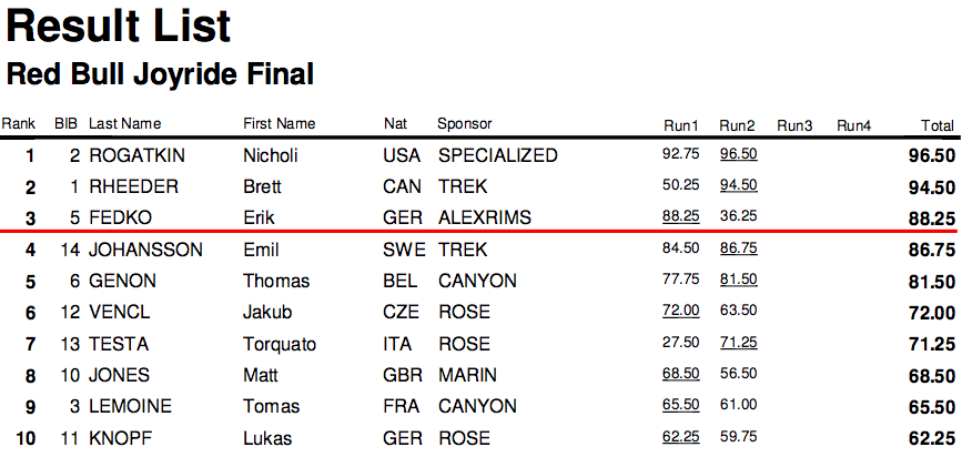 Erik Fedko completed the podium, capping off his breakthrough season with his first podium at Red Bull Joyride. After missing the entire season, there was also a notable return from Emil Johansson who took an early lead and ended the event just outside of the podium in fourth.